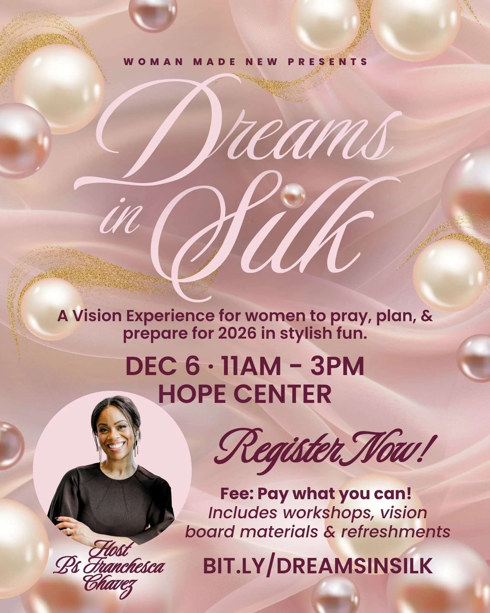A vision & prayer experience for women—join us in silk, satin, or velvet PJs for worship, sisterhood, and 2026 vision board creation!